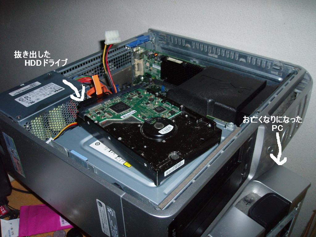とりあえずHDDは救済できた。 っていうか、HDDをぶち壊れたPCから引っこ抜いて、別のPCに差したら何ら問題なく起動できた件。 うーん、これで故障部位はマザーボードでほぼ確定・・・ これすなわち、データの救済はできるものの、PC自体はボツになっちゃうなあ・・・ ただ、最近ミニタワーがお気に入りで、ちっこいPCばっかり買ってたもんだから、HDDが生きてることはわかったものの、差すところがないw ていうかまず差すスペースがない。 致し方なく、こんな状態に。 お亡くなりになったPCは、中身の使えそうな部品を引っこ抜かれた揚句、今後は踏み台として余生を送ってもらう予定ですw てか、ミニタワーは基本的に増設を考慮した造りになってないので、正直困った。 マザーボードの形状的に、SATAの端子が2つしかないんだけど、DELL出荷時の状態でHDDとDVDドライブで全部埋まってたし・・・・・・・ まあ結局DVD引っこ抜いちゃったんですが。 やっぱり、新しいPC買わないとダメだなー・・・ フタしまらないしなあw