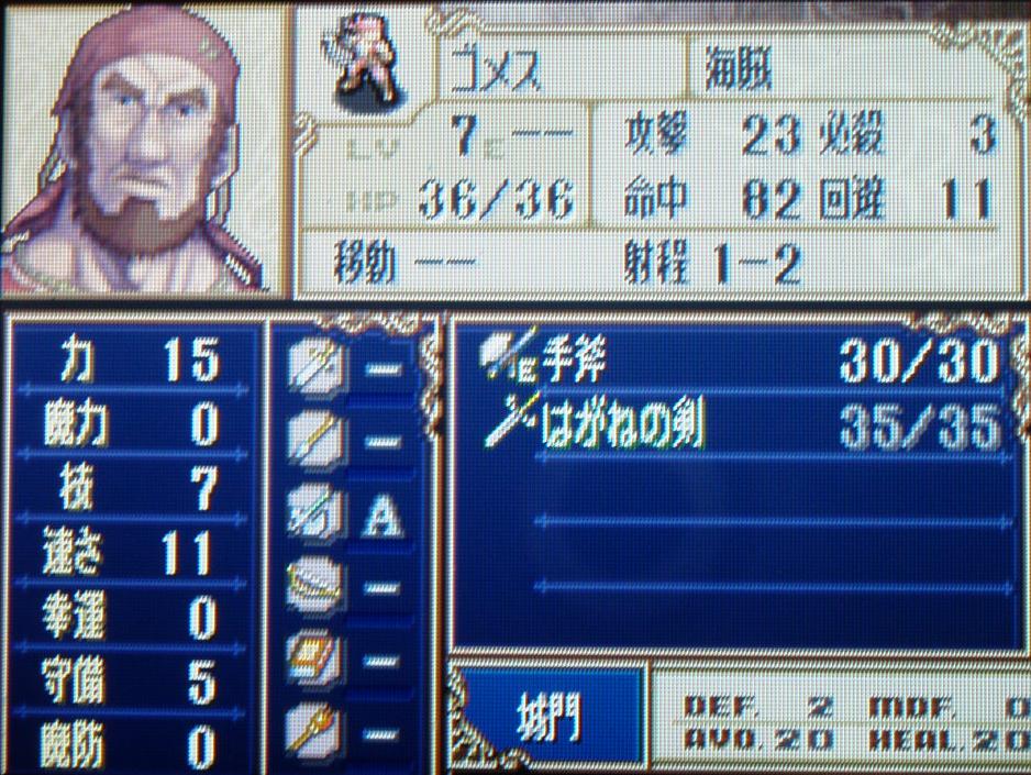 疲れた・・・w 最初の右上の一団は、ファミコン版より数が減少。 それでも強さが倍なので結局苦戦するんだけど。 それとファミコン版では攻撃してこない盗賊が襲い掛かってきます。盗賊といえどはっきり言って強いのでこれが案外困る・・・ そしてさりげなく雑魚の海賊も1章よりパワーアップ。 ドーガを盾にしたらダメージ10x2で即死しました。もうあの鎧役にたたねえよちくしょうw ダロス復活! でも 向こうから話しかけてくる→勝手に仲間になる→そのターンのうちに死ぬ っていう非常にどうしようもないコンボが成立するおかげで、面倒なことにw 左側の部隊は、最初に攻めてくるソシアルナイト2体でもう大苦戦。 海賊と違って防御がかなりあるのでとにかく攻撃が効かない・・・ レイピアは3すくみのおかげで命中しなくなってるし。 ※今書いてて気づいたんですが、ウイングスピアで戦えばよかったのか・・?w ウイングスピアってのは、シーダ専用の新武器で、レイピアと同様の特効を持った槍です。 そういやカシムはSFC版だとソシアルナイトと一緒にゲーム開始時から突っ込んでくるけど、今回は初期位置で待機の動きになったようです。 これはFC版と同じなので、やっぱりFC版を元にリメイクしたようですね・・・ それと、マップ中央部分にセーブポイントがありました。 これは完全に新機能ですが、やはり無いと厳しいと踏んでの救済措置でしょうか・・?w まぁおかげで後半のリスクが大分減少してくれましたが^^ そしてボス・・・ 今回も凶悪だった^^; しかも手斧の仕様がFC版に準拠しているので、軽いw 軽いので、速い、回避できない、射程長い、とまぁなんとも・・・ ちなみにこんな強さ。 結局、 剣が使えないやつはさっぱり戦えない 遅いやつは再攻撃が来るので戦えない 力が低いとダメージが与えられない(毎ターン8ポイント回復するので、結構与えないと困る) てな感じになりまして、何とか戦えそうなのがオグマ一人。 しかも攻撃に一回しか耐えられないので、自分のターンには攻撃できませんでした。 敵の隣に待機→敵のターンに反撃→反撃をくらったら砦で回復 これを延々と繰り返し。 65ターンかかりました・・・orz これ、相手が海賊じゃなくなったらどうなるんだか・・・・・・・・・・ 昨日来た訳ですが・・・ ファイアーエムブレムバカとして名を馳せる(?)あたしとしちゃあ、 難易度はとりあえず最高にしとこうと思ったわけですよ。